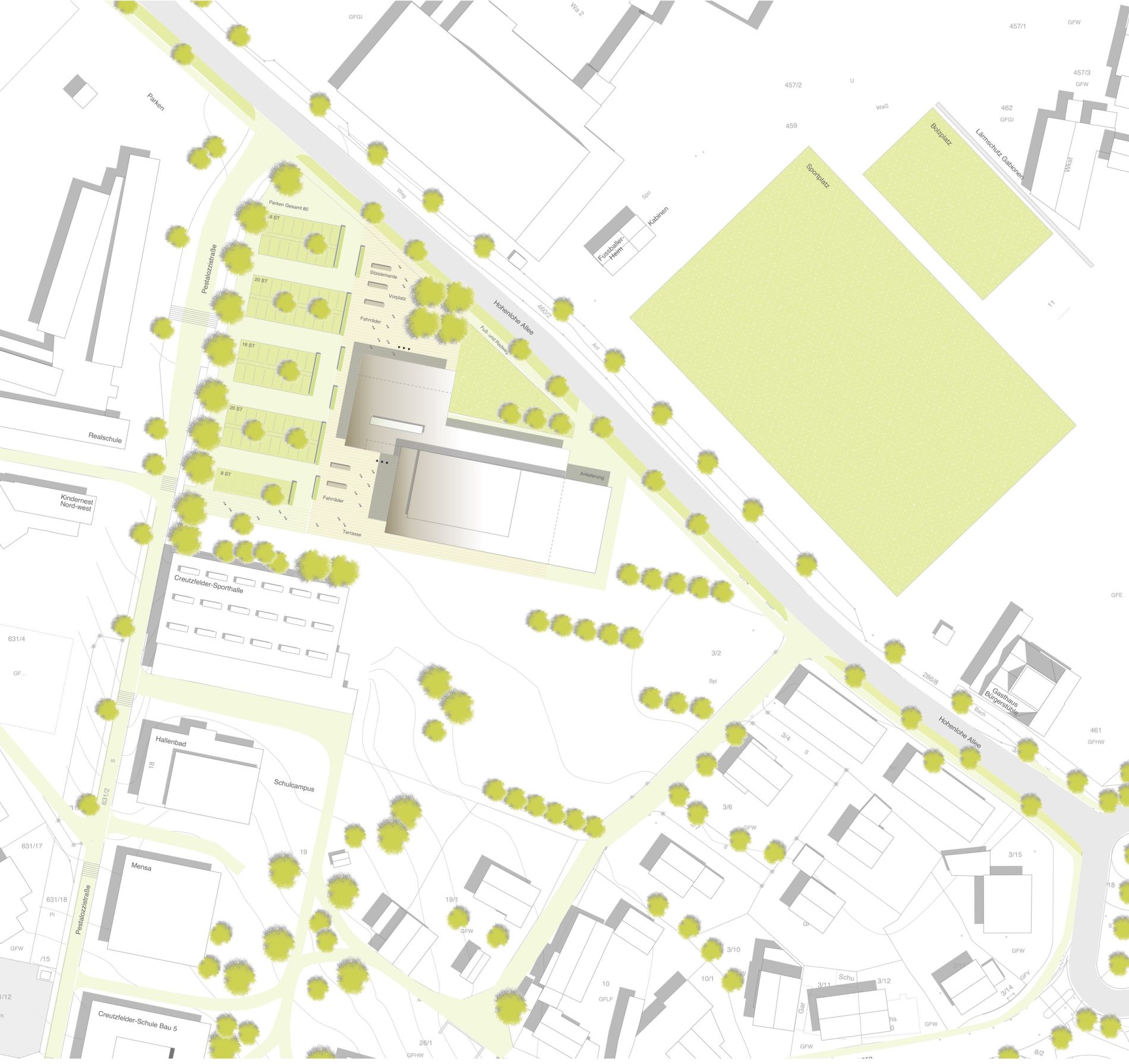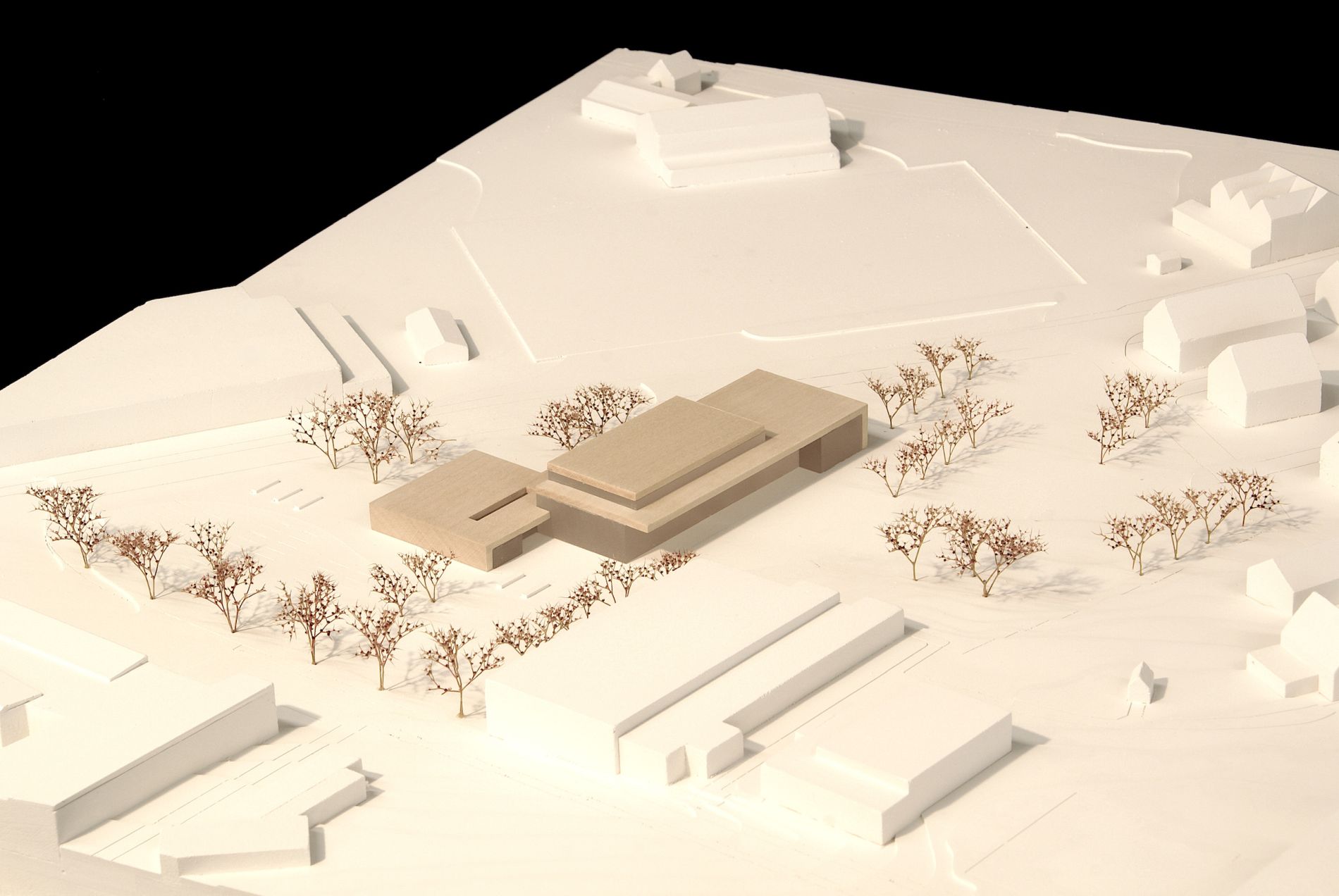 Die neue Gemeindehalle als additiver Solitär in der Reihe der Gebäude im Schul-Campus stellt eine unverkennbare neue Adresse im engen Einklang mit der Umgebung dar.
