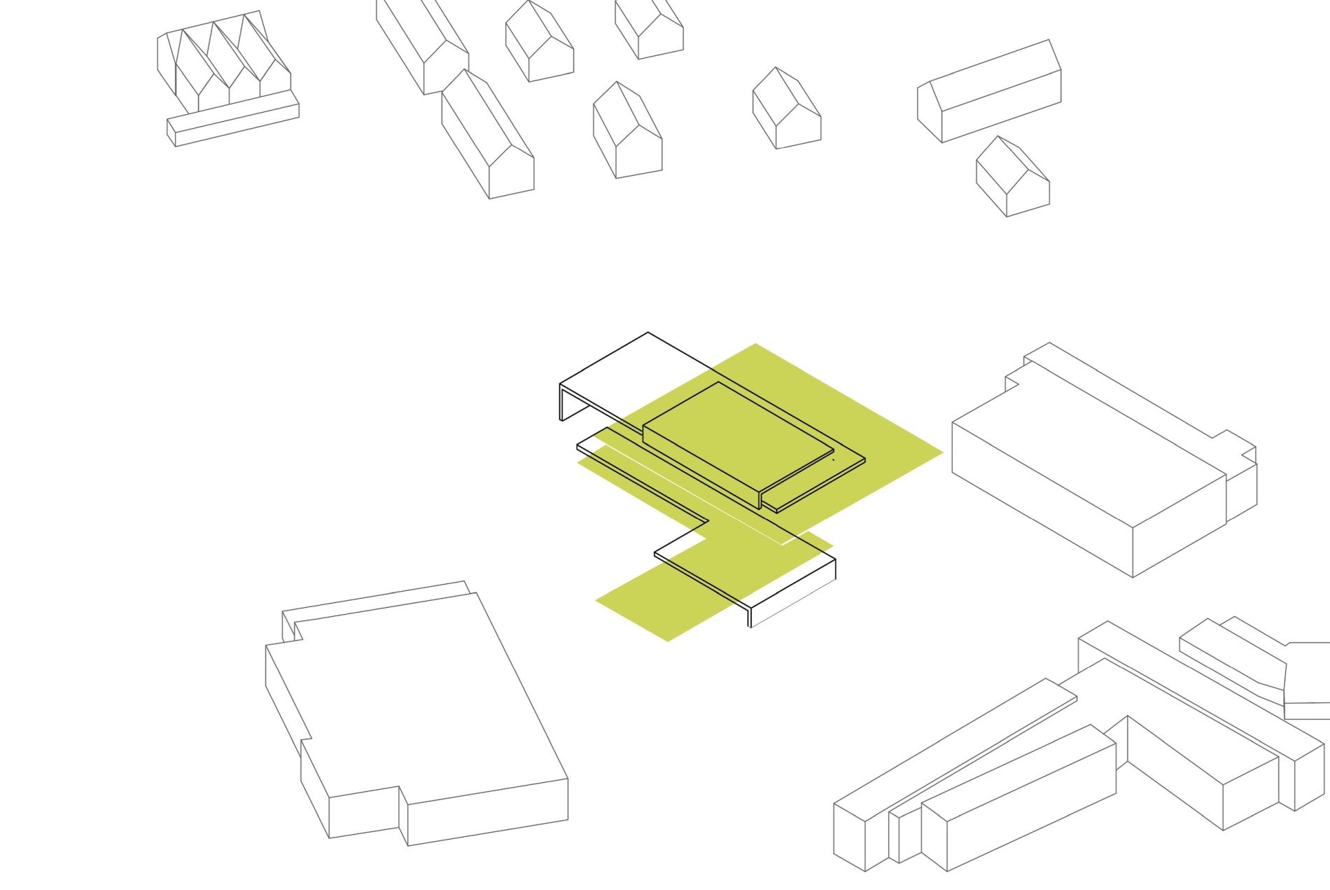 Zwei „Winkel“ stehen, der eine für das Foyer mit Servicebereich und der zweite für den Saal gespiegelt zueinander und öffnen sich als weite Dachauskragung jeweils in den Freibereich, nach Norden zum Vorplatz an der Hohenlohe-Allee und nach Süden zum Schul-Campus.