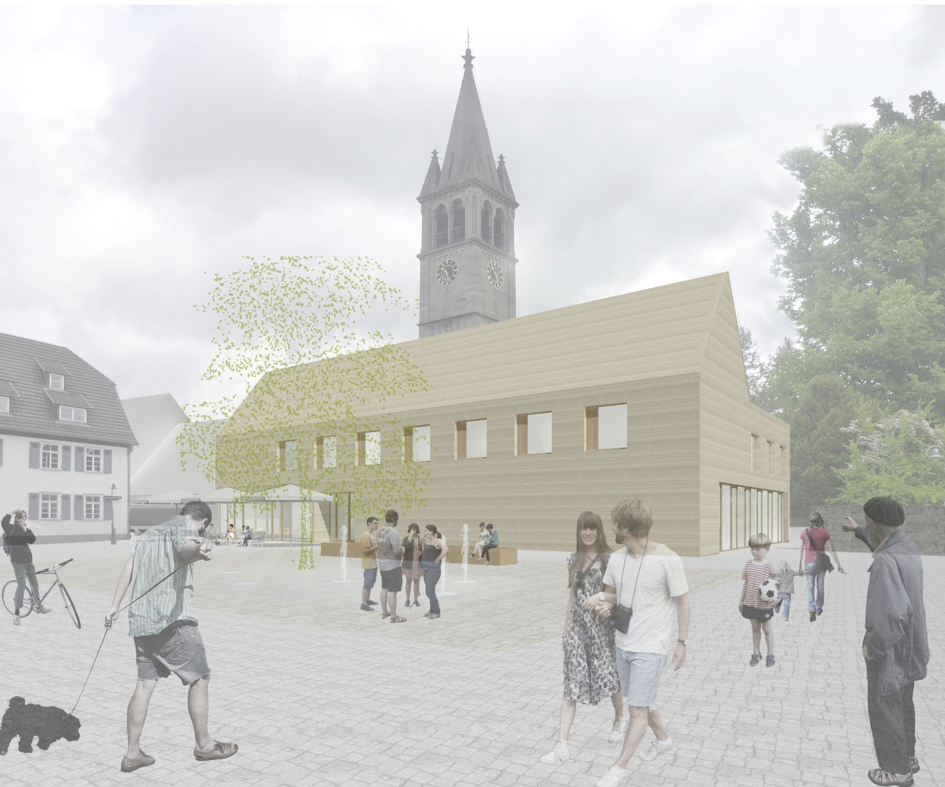 Der ortsbildprägende gefasste Charakter des Vorplatzes im Norden zum Markt hin bleibt erhalten. Ebenso wird die „Raumfuge“ zum Agnes-Kneher-Platz großzügiger und offener. Im öffentlichen Raum wird der Neubau als der Michaelskirche zugehörig erlebbar, und zugleich markiert er städtebaulich prägnant den Abschluss des Marktplatzes. Das „Haus der Kirche“ wird zum Dreh- und Angelpunkt und Kommunikationsort für Gemeinde, Besucher, für die Bewohner Degerlochs und darüber hinaus.
